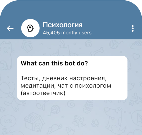 Наш бот помогает улучшить психологическое состояние, предлагая проверенные методики, анализ эмоций и поддержку на основе современных AI-технологий.
